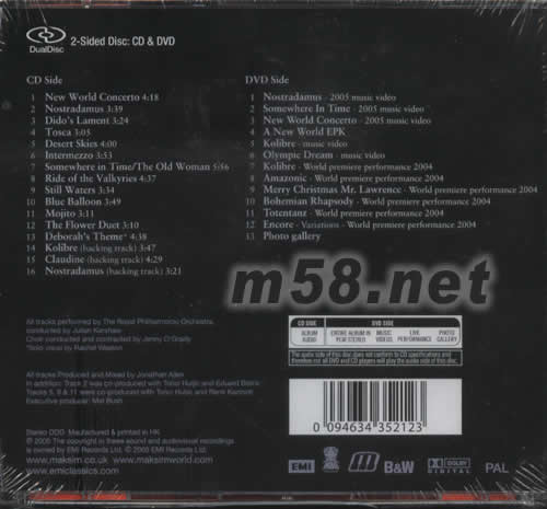 DVD SIDE 1.NOSTRDAMUS--2005 MUSIC VIDEO 2.SOMEHERE INTIME-2005 MUSIC VIDEO 3.NEW WORID CONCERTO --2005 MUSIC VIDEO 4.A NEW WORID EPK 5.KOLIBRE--MUSIC VIDEO 6.OLYMPIC DREAM--MUSIC VIDEO 7.KOLIBRE--WORLD PREMIERE PERFORMANCE 2004 8.AMAZONIC -- WORLD PREMIERE PERFORMANCE 2004 9.MERRY CHRISTMAS MR,LAWRENCE--WORLD PREMIERE PERFORMANCE 2004 10.BOHEMIAN RHAPSODY--WORLD PREMIERE PERFORMANCE 2004 11.TOTENTANZ- WORLD PREMIERE PERFORMANCE 2004 12.ENCORE--VARIATIONS --WORID PREMIERE PERFORMANCE 2004 13.PHOTO GALLERY