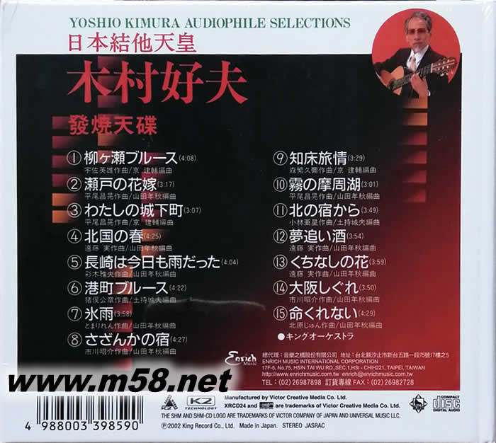 吉他天皇 發燒天碟(1)Audiophile Selections XRCD+SHMCD(m58.net) 日本吉他天王-木村好夫的演奏技巧精湛但絕不刻意炫技,不疾不徐,盡顯一代大師的絕佳風范。King發燒級錄音效果,吉他線條呈現出清晰飽滿、晶瑩通透、飄逸輕靈的聽覺感受,可以說是吉他演奏的示范級錄音。日本地位最崇高的「吉他天皇」木村好夫,除了以精湛出色的吉他演奏技巧詮釋日本演歌獲得廣大樂迷的喜愛之外,他的編曲與演奏風格更對整個亞洲音樂的發展具有關鍵性的影響,木村好夫的演奏早已成為一個時代的共同回憶。在許多老資格的發燒友心中,木村好夫更是「發燒」的代名詞,只要是他的專輯必定是錄音絕佳的作品。許多知名的吉他演奏家經常是以表現高難度的演奏技巧來讓人折服,木村好夫則不然,他總是步調優雅不疾不徐,表現輕快愉悅的曲子時不會顯得過動浮躁;詮釋抒情優美的歌曲則沒有太多的憂傷煽情。這張由 Enrich Music 發行的精選大碟,收錄了樂迷們最耳熟的「柳瀬藍調」、「瀨戶之新娘」、「北國之春」、「港町藍調」等十五首經典演出,特別取得日本 King Music 原始母帶精心製作,音質純凈,並以全新的豪華紙板硬殼包裝,更顯珍藏的價值。在整張精選集錄音中,吉他的音色通透自然、清晰明亮而又溫暖飽滿,將這些宛如星空中最閃亮的星光一般的經典演繹得更加不朽!