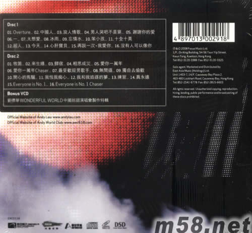 CD 1 01. Overture 02. 中國人(國) 03. 浪人情歌 (國) 04. 男人哭吧不是罪 (國) 05. 謝謝你的愛 (國) 06. 一 (國) 07. 太想愛 (國) 08. 冰雨 (國) 09. 忘情水 (國) 10. 笨小孩 (國) 11. 十全十美 (粵) 12. 超人 (國) 13. 今天 (國) 14. 心肝寶貝 (國) 15. 再說一次.我愛你 (國) 16. 沒有人可以像你 (國) CD 2 01. 牧笛 (國) 02. 來生緣 (國) 03. 歸宿 (國) 04. 相思成災 (國) 05. 愛你一萬年 (國) 06. 愛你一萬年 Chaser 07. 最受歡迎男歌手 (國) 08. 無間道 (粵) 09. 獨自去偷歡 (粵) 10. 開心的馬騮 (粵) 11. 我恨我癡心 (粵) 12. 我和我追逐的夢 (國) 13. 練習 (國) 14. 真永遠 (國) 15. Everyone is No.1 (國) 16. Everyone is No.1 Chaser Bonus VCD 劉德華Wonderful World中國巡回演唱會制作特輯