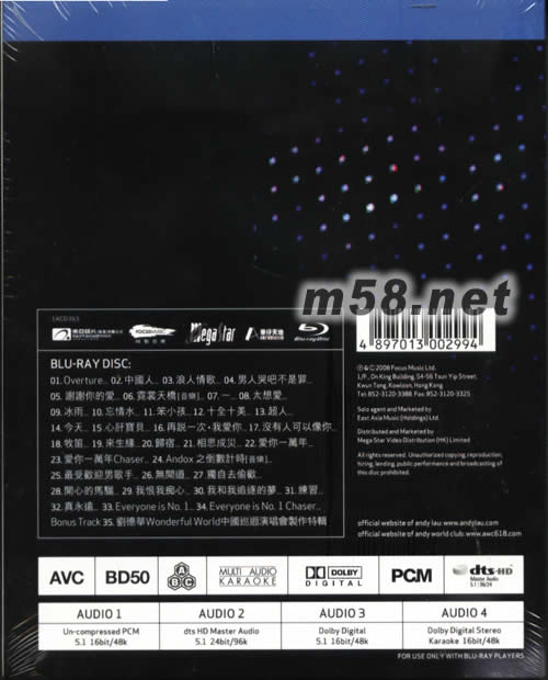 中國巡回演唱會 上海 Karaoke 藍光DVD(m58.net) 超越想像的震撼 親歷8萬人演唱會 忘情水 / 冰雨 / 笨小孩 / 相思成災 / 牧笛 / 練習 / 真永遠 / 愛你一萬年 至尊級高清 1920 X 1080 系統(tǒng)攝制 Blu-ray加送 劉德華Wonderful World 中國巡迴演唱會 制作過程 + 幕後花絮 大曝光 * Sound Mix : - Un-compressed PCM 5.1 - dts HD master Audio 5.1 24bit/98k - Dolby Digital 5.1 - Dolby Digital Stereo Karaoke