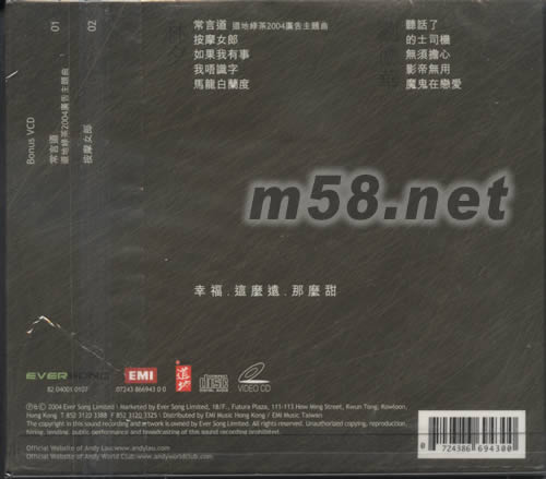1、 常言道 (道地綠荼2004廣告主題曲) 2、按摩女郎 3、如果我有事 4、我唔識字 5、馬龍白蘭度 6、聽話了 7、的士司機 8、無須擔心 9、影帝無用 10、魔鬼在戀愛 11、幸福還那么遠那么甜 VCD - 首批限量附送 01. 常言道 (Music Video) 道地綠茶204廣告主題曲 02. 按摩女郎 (Music Video)