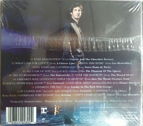1. PURE IMAGINATION 純真印象 選唱自《巧克力冒險(xiǎn)工廠》的1971年電影版名曲,是個(gè)性怪異但保有赤子之心的威利旺卡,介紹自己的巧克力工廠時(shí)所唱之歌 2. WHAT I DID FOR LOVE 情到深處無(wú)怨尤 選唱自1975年推出至今曾創(chuàng)下百老匯演出最久票房記錄的《歌舞線上》,唱出一位表演工作者為了自己所愛(ài),愿意付出一切絕不后悔的心情 3. BRING HIM HOME 帶他回家 選唱自締造連續(xù)演出30年的傳奇音樂(lè)劇《悲慘世界》,描述尚萬(wàn)強(qiáng)面對(duì)女兒的愛(ài)人垂死之際,祈求上帝保他平安,並愿捨身相換之歌 4. LE TEMPS DES CATHÉDRALES 大教堂時(shí)代 選唱自有史以來(lái)最受歡迎的法語(yǔ)音樂(lè)劇《鐘樓怪人》,此曲是由吟游詩(shī)人於開(kāi)場(chǎng)時(shí)歌詠,描繪15世紀(jì)末巴黎的愛(ài)與慾望之歌 5. ALL I ASK OF YOU 我所求於你 (與 凱莉克萊森 深情對(duì)唱) 選唱自大師韋伯的《歌劇魅影》,是在魅影殺人之后,女主角克莉絲汀的青梅竹馬勞爾為了撫慰她而對(duì)唱的浪漫經(jīng)典二重唱 6. TRY TO REMEMBER 追憶 選唱自42年來(lái)連續(xù)上演共計(jì)17162場(chǎng),締造劇場(chǎng)奇蹟?shù)摹秹?mèng)幻愛(ài)程》,此曲的知名度更甚音樂(lè)劇本身,多年來(lái)吸引無(wú)數(shù)歌手不斷傳唱 7. OVER THE RAINBOW 飛越彩虹 選唱自最經(jīng)典的歌舞片《綠野仙蹤》,傳遞了想要逃避混亂世界、走向彩虹彼端的心聲,被公認(rèn)為美國(guó)最經(jīng)典的歌曲之冠 8. CHILDREN WILL LISTEN/NOT WHILE I’M AROUND 孩子會(huì)聆聽(tīng)/有我在 選唱自美國(guó)當(dāng)代音樂(lè)劇大師史蒂芬桑罕的《魔法黑森林》與《瘋狂理髮師》兩部作品,「孩子會(huì)聆聽(tīng)」是女巫告誡長(zhǎng)髮公主所唱,「有我在」則是孤兒慰藉老板娘之歌 9. YOU’LL NEVER WALK ALONE 你永遠(yuǎn)不必獨(dú)行 選唱自敘述男主角比利在死后,有20小時(shí)回到人間補(bǔ)償過(guò)錯(cuò)的音樂(lè)劇《旋轉(zhuǎn)木馬》,此閉幕曲已超越音樂(lè)劇插曲的地位,成為20世紀(jì)的勵(lì)志名曲 10. OLD DEVIL MOON 邪惡的月亮 選唱自1947於百老匯推出,並於1968年由《教父》導(dǎo)演柯波拉改拍為歌舞片的《彩虹仙子》,描述月亮對(duì)於愛(ài)情的魔幻力量,已成為當(dāng)今爵士樂(lè)的標(biāo)準(zhǔn)經(jīng)典曲目 11. FINISHING THE HAT 畫(huà)好高帽 選唱自入圍10項(xiàng)東尼獎(jiǎng),更贏得8座戲劇桌獎(jiǎng)的《星期天與喬治上公園》音樂(lè)劇,此曲是劇中法國(guó)點(diǎn)畫(huà)派名家喬治秀拉闡述自己創(chuàng)作理念的著名歌曲 12. IF I LOVED YOU 如果我愛(ài)你 (與 奧德拉麥唐娜 深情對(duì)唱) 另一首選唱自《旋轉(zhuǎn)木馬》的名曲,並找來(lái)囊括6座東尼獎(jiǎng)的音樂(lè)劇天后 奧德拉麥唐娜 獻(xiàn)聲助陣,是劇中男女主角幻想兩人若相戀會(huì)做什么事的對(duì)唱情歌 13. ANTHEM 頌歌 選唱自1984年推出的音樂(lè)劇《棋王》,2003年紐約與2008年倫敦的慈善義演便是由喬許飾演劇中俄國(guó)棋王一角,本專輯特別收錄,別具意義! 14. GOLD CAN TURN TO SAND 點(diǎn)金成沙 選唱自瑞典ABBA合唱團(tuán)成員所推出的音樂(lè)劇《克莉絲汀娜》,描寫(xiě)19世紀(jì)一位堅(jiān)毅的瑞典女性移民至美國(guó)的奮斗故事之歌 15. EMPTY CHAIRS AT EMPTY TABLES 空桌空椅 選唱自特別著重在1832年巴黎共和黨人起義史實(shí)的《悲慘世界》,這場(chǎng)由學(xué)生發(fā)動(dòng)的六月革命,最后學(xué)生幾乎都被政府軍殺死,唯一被救活的馬利斯舊地重返,唱出了此曲悼念已逝的朋友們,十分悲愴動(dòng)人!