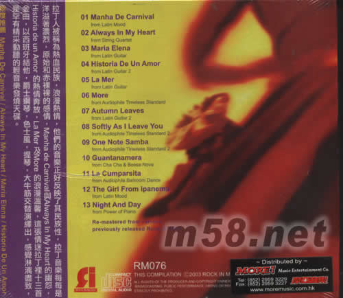 價格為估,以實到貨為準! 情迷拉丁(m58.net) 史上最膾炙人口的拉丁金曲 超高解像錄音制作的精采演奏 超真實的臨場感 醉人的樂器音色 2003年度必備天碟 拉丁人被稱為熱血發(fā)族,浪漫熱情,他們的音樂正好反映了其民族性,拉丁音樂每每是洋溢著濃烈,原始和裸裸的感情,MANHA DE CARNIVA 與ALWAYS IN MY HEART 的幽怨,HISTORIA DE UN AMOR 的熱情奔放,LA MER 膠MORE 的浪漫溫馨,這張情迷拉丁里十三首金曲,以西班牙結(jié)他,爵士鋼琴,色士風,提琴,大牛筋交替演釋出,感覺淋漓盡致,是罕有精采動聽的輕音樂發(fā)燒天碟。 極度推存 MANHA DE CARNIVAL/ALWAYS IN MY HEART /MARIA ELINA /HISTORIA DE UN AMOR