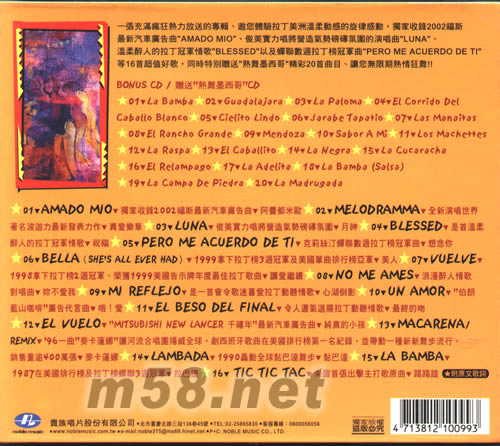 1.AMADO MIO*獨家收錄2002福斯最新汽車廣告曲*阿曼都米 2.MELODRAMMA*全新演唱世界著名波迦力最新發表力作*真愛樂章 3.LUNA*俊美實力唱將營造氣勢磅礴氛圍*月神 4.BLESSED*是首最柔醉人的拉丁冠軍情*祝福 5.PERO ME ACUERDO DE TI *克莉絲丁蟬聊數過拉丁榜軍曲 *想念你 6.BELLA(SHE'S ALL EVERHAD)*1999拿下拉丁榜3周冠軍及美國音曲排行榜亞軍*美人 7.VUELVE*1998拿下平拉丁榜2周冠軍、榮獲1999美國告示牌年度最佳拉丁歌曲*讓愛繼續 8.NO ME AMES*浪漫醉人的情歌對唱曲*你不愛我 9.MI REFLEJO*是一首令歌迷喜愛拉丁動聽情歌*心湖倒影 10.UN AMOR*“伯朗藍山咖啡”廣告代言曲*哦!愛 11.EL BESO DEL FINAL令人蕩氣回腸拉丁動聽情歌*最終的吻 12.EL VUELO*“MITSUBISHI NEW LANCER 千喜年”最新汽車廣告曲*純真的小孩 13.MACARENA/REMIX*‘96一曲“麥子卡蓮娜”讓河流合唱團揚威全球,創西班牙歌曲在美國排行榜第一名紀錄,并帶動一種新新舞步流行、銷售量過400萬張*麥卡蓮娜 14.LAMBADA*1990轟動全球隊粘巴達舞步*粘巴達 15.LA BAMBA*1987在美國排行榜及拉丁榜蟬聊3周冠軍*拉巴達 16.TIC TIC TAC*朱茵首張郵擊主打歌原曲*踢踢踏踏 BONUS CD/贈送“熱情墨西哥”CD 1.LA BAMBA 2.GUADA JAJARA 3.LA PALOMA 4.EL CORRIDO DEL 5.CIELITO LINDO 6.JARABE TAPATIO 7.LAS MANAITAS 8.EL RANCHO GRANDE 9.MENDOZA 10.SABOR A MI 11.LOS MACHETTES 12.LA RASPA 13.EL CABALLITO 14.LA NEGRA 15.LA CUCARACHA 16.EL RELAMPAGO 17.LA ADELITA 18.LA BAMBA(SATSA) 19.LA CAMPA DE PIEDRA 20.LA MADRUGADA