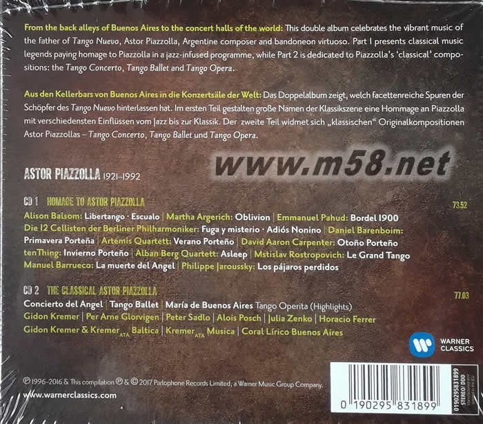 CD1: Homage to Piazzolla: Great Artists play Piazzolla 1. Libertango - Alison Balsom 2. Tre Tanghi: II. Oblivion - Martha Argerich 3. Maria de Buenos Aires: Fuga y misterio - Die 12 Cellisten der Berliner Philharmoniker 4. Cuatro estaciones portenas: No 3 Primavera portena - Daniel Barenboim 5. Cuatro estaciones portenas: No 1 Verano Porteno (Tempo di Tango) - Jacques Ammon 6. Cuatro estaciones portenas: No 2 Otono porteno - David Aaron Carpenter 7. Cuatro estaciones portenas: No 4 Invierno Porteno (Buenos Aires Winter) - Tine Thing Helseth 8. History of the Tango: I. Bordel 1900 - Emmanuel Pahud, Christian Rivet 9. Tango Sensations: No. 1 Asleep - Alban Berg Quartett 10. Le Grand Tango - Mstislav Rostropovich 11. Addios Nonino - Die 12 Cellisten der Berliner Philharmoniker 12. La muerte del angel - Manuel Barrueco 13. Los pajaros perdidos - Philippe Jaroussky 14. Esqualo - Alison Balsom CD2: Classical Piazzolla: Tango Concerto, Tango Ballet, Tango Opera 1. Concierto del Ángel: I Introduccion al Ángel 2. Concierto del Ángel: II Milonga del Ángel - 3. Concierto del Ángel: I La muerte del Ángel 4. Concierto del Ángel: IV Resurreccion del Angel Gidon Kremer , Per Arne Glorvigen, Alois Posch, Vadim Sakharov KremerATA Baltica • Rolf Gupta direction 5. Tango Ballet: I. Titulos 6. Tango Ballet: II. La Calle 7. Tango Ballet: III. Encuentro - Olvido 8. Tango Ballet: IV. Cabaret 9. Tango Ballet: V. Soledad 10. Tango Ballet: VI. La Calle Gidon Kremer,Ula Zebriunaite solo viola (7),Marta Sudabra solo cello (7, 8), KremerATA Baltica • Rolf Gupta direction 11. Maria de Buenos Aires: Alevare 12. Maria de Buenos Aires: Yo soy Maria 13. Maria de Buenos Aires: Fuga y Misterio 14. Maria de Buenos Aires: Misere Canyengue de los Ladrones Antiguos en las Alcantarillas 15. Maria de Buenos Aires: Tangata del Alba 16. Maria de Buenos Aires: Milonga de la Anunciacion 17. Maria de Buenos Aires: Tangus Dei Horacio Ferrer El Duende, Narrator Jairo Antiguo Ladrón, Voz de Ese Domingo, Coral Lírico Buenos Aires (Chorus master: Ricardo Ochoa), Gidon Kerner & KremerATA Musica