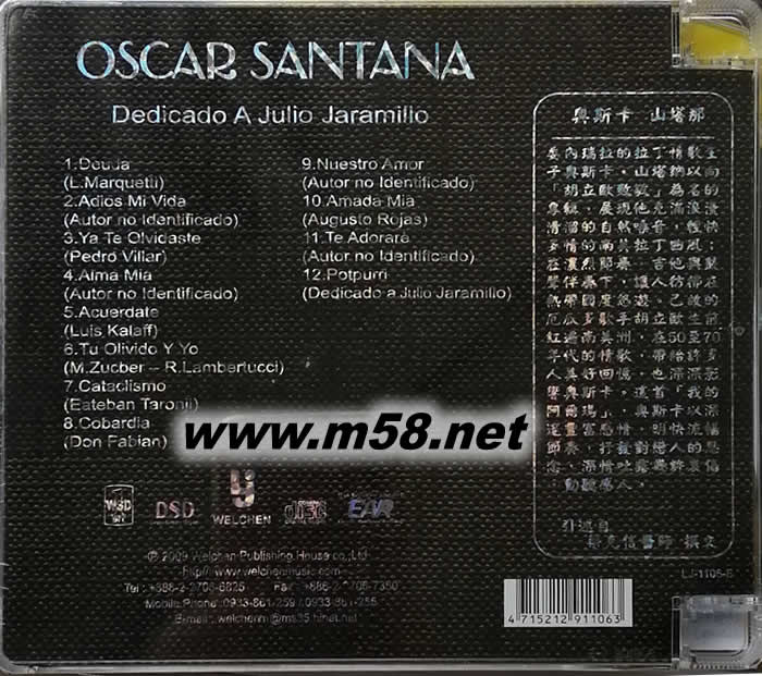 奧斯卡 山塔納 向胡里奧致敬 Oscar Santana - Dedicado A Julio Jaramillo(m58.net) 這是Emerald Audiophile公司最新發行的一款絕對發燒錄音專輯,內收錄了由拉丁情歌王子奧斯卡?山塔納傾情演唱的12首歌曲,強烈推薦。 委內瑞拉的拉丁情歌王子奧斯卡?山塔納在這款專輯中展現他充滿浪漫滑溜的自然嗓音,輕快多情的南美拉丁曲風;在濃烈節奏,吉他與鼓聲伴奏下,讓人彷佛在熱帶國度悠游。這款專輯主要表達了為歌手胡立歐的深深懷念,已故的厄瓜多歌手胡立歐生前紅遍南美洲,在50至70年代的情歌,帶給許多人美好回憶,也深深影響奧斯卡,其中一首《我的阿爾瑪》,奧斯卡以深邃豐富感情,明快流暢節奏,抒發對戀人的思念,深情吐露幾許哀傷,動聽感人。 值得一提,該唱片采用“翡翠CD”壓制,一種更臻成熟完美的翠綠聚碳酸脂高保真光盤。您如果對于高級的燒錄片稍有研究,一定就會聽過日本的太陽誘電公司,他們所推出的光盤片可說是最頂尖的產品,當然售價也高于一般光盤片許多。其實這間公司的專業是在光記錄媒體,換句話說,只要是使用光的方式來技術的媒材,他們可是真正的專家。根據他們的研究,CD片表面的顏色會影響CD唱盤雷射頭讀取的精確度,而采用“綠色聚碳酸脂”制作的CD可有效抑制一般CD片容易產生的微小反射與干擾,提高讀取的精確度。 現在就有唱片公司應用這種技術制作“翡翠CD”,比如Emerald Audiophile公司最新發行的不少唱片就如此,在聽感上,最明顯的變化就是分辨率更高,定位更清晰,音質也有明顯的優化,呈現出有如水晶一般的通透聲響。另外,最重要的是在壓制CD前的“母帶處理”,Emerald Audiophile公司這一系列“翡翠CD”當然也不可能馬虎,全系列重新制作高優質的母帶再以“翡翠CD”壓制,絕對能滿足音響迷最挑剔的耳朵。 專輯曲目