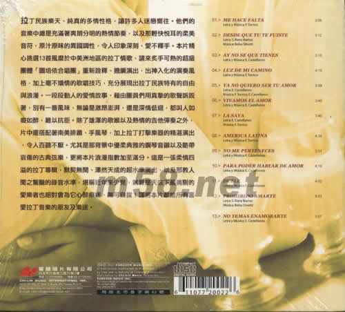 拉丁民族樂天、純真的多情性格,讓許多人迷戀向往。他們的音樂中總是充滿著爽朗分明的熱情節奏,以及那輕快悅耳的柔美音符,原汁原味的異國調性,令人印象深刻、愛不釋手。本片精心挑選13首風靡于中美洲地區的拉丁情歌,請來炙手可熱的超級團體“圖培依合唱團”重新詮釋、擔綱演出,出神入化的演奏風格,加上毫不矯情的歌唱技巧,充分展現出拉丁民族特有的自由與浪漫。一段段動人的愛情故事,藉由團員們用真摯的歌聲訴說著,別有一番風味,無論是激昂澎湃,還是深情低回,都叫人如癡如醉,難以抗拒。除了雄渾的歌喉以及熱情的吉他彈奏之外,片中還搭配著南美排蕭、手風琴,加上拉丁打擊樂器的精湛演出,令人百聽不厭。尤其是那背景中優柔典雅的鋼琴音韻以及略帶哀傷的古典弦樂,更將本片浪漫指數加至滿分。這是一張柔情四溢的拉丁專輯,默契無間、渾然天成的超水準演出、以及那教人聞之驚艷的錄音水準,堪稱近年來少見,就算是天底下最挑剔的愛樂者也絕對會為它心醉癡迷、無可自拔!謹將本片獻給所有喜愛拉丁音樂的朋友及樂迷。