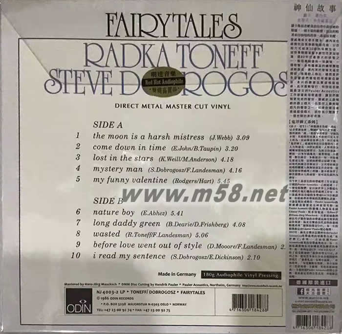 Fairytales 童話 神仙故事 180g 33RPM LP 黑膠(CD 圣經 最佳試音碟)限量版(m58.net) 本碟被"CD圣經"譽為八十年代最偉大的錄音之一,北歐挪威的錄音。不知為什么,它有別于一般的發燒碟的夸張和浮躁。 人聲和鋼琴音色通透度實在太好了,完美,一塵不染!鋼琴的晶瑩剔透象一顆顆珍珠跌落你的心房; 甜美清純的女聲,如炎熱的夏天往心田注入一涓涓清澈透明的冰雪水。 自古紅顏多薄命。聽挪威女歌手璐達卡托妮芙這段如靜谷幽蘭般的演唱時,你有沒有想到這位玉殞香消的女歌手是因為精神抑郁,最終自盡的嗎? 早期的數碼錄音(1986年)已能將托妮芙絕美歌聲中的微微顫抖細細捕捉下來,叫人感受到隱藏其中的那份悲情氣質。忠告您:在心情不佳時請將此歌跳過,暫勿聆聽。 這張唱片在海外雅皮土中風行已久,當年的LP大碟幾乎被賣瘋。香港某刊在評論這張唱片時風趣地說:"此碟一播,成村的人都話要買!"。可見好端端的人們都搶著欣賞其中凄美,爭著體味那悲悲切切、愁腸寸斷的感覺。你聽,托妮芙的歌聲是否好象來自天空的某一處?那透明晶瑩的鋼琴伴奏是否象澗中溪流般沁人心脾?好了,不妨礙你了,閉上眼慢慢醉去吧!