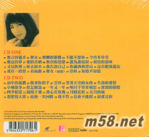 CD ONE 01. 無(wú)言的溫柔 02. 舞女 03. 無(wú)聊的游戲 04. 不能不想你 05. 今宵多珍重 06. 難忘的夢(mèng) 07. 愛(ài)的苦酒 08. 無(wú)奈的思緒 09. 誰(shuí)為誰(shuí)流淚 10. 相思的滋味 11. 又見(jiàn)炊煙 12. 抹去淚水 13. 我告訴自己 14. 你瀟灑我漂亮 15. 是否把我遺忘 16. 我有一段情 17. 春風(fēng)曲 18. 舞女(福建) 19. 奈何 20. 知道不知道 CD TWO 01. 雨中的孤雁 02. 挽著你的手 03. 云河 04. 望著天空的女孩 05. 失落的愛(ài)情 06. 小城故事 07. 你怎么說(shuō) 08. 一年又一年 09. 明月千里寄相思 10. 深深的戀情 11. 四季相思 12. 鳳凰于飛 13. 我心若玫瑰 14. 月圓花好 15. 五月的風(fēng) 16. 想把情人留 17. 最后一次回眸 18. 我不管 19. 良夜不能留 20. 最愛(ài)是你