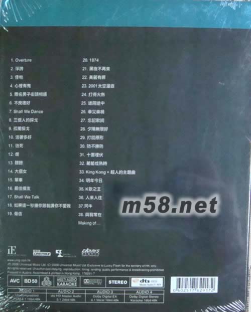 01 Overture 02 浮夸 03 怪物 04 心里有鬼 05 兩名男子街頭相遇 06 不良嗜好 07 Shall We Dance 08 三個人的探戈 09 孤獨探戈 10 活著多好 11 怕死 12 爛 13 聽聽 14 大個女 15 單車 16 最佳損友 17 Shall We Talk 18 如果這一秒鐘你跟我講你不愛我 19 傷信 20 1874 21 黑夜不再來 22 美麗有罪 23 2001 太空漫游 24 打得火熱 25 送院途中 26 幸災樂禍 27 忘記歌詞 28 夕陽無限好 29 打回原形 30 防不勝防 31 十面埋伏 32 葡萄成熟時 33 King Kong/超人的主題曲 34 明年今日 35 K歌之王 36 人來人往 37 阿牛 38 與我常在 making of....