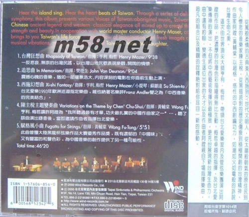 臺灣狂想曲RHAPSODY OF TAIWAN 管弦樂(m58.net) ★本專輯入圍2001年第十二屆金曲獎「最佳作曲人獎」及「最佳古典音樂專輯」★ 指揮:亨利 梅哲 這次曲中還有約翰.樊德生這位出眾的天才以及作曲者阿鏜親自下場指揮,從萬般柔情的古典美人西施到xy世代文明人;從太陽般朝氣的原住民到令人懷念的音樂家陳主稅;從黑暗斑剝的歷史傷痕到積極開創(chuàng)的臺灣精神......,超凡的組合以及精闢的詮釋,絕對讓你耳目一新,深受感動! 此輯由世界頂尖指揮大師享利.梅哲帶領(lǐng)臺北愛樂室內(nèi)及管弦樂團(tuán),演出本土作曲家阿鏜(黃輔鏜)的作品。梅哲卓越的指揮,阿鏜超格、感性的中西創(chuàng)編功力及國際知名提琴手--蘇顯達(dá)、臺北愛樂的傳神演出,如潮如火如電般地訴說臺灣生命之美,不但將中西藝術(shù)發(fā)揮到最極致,更充份展現(xiàn)新臺灣人的生命力。