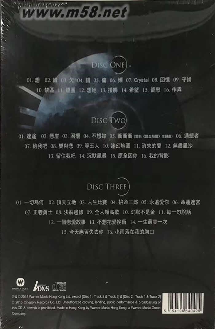 CD 1 01. 想 02. 緣 03. 欠 04. 錯 05. 痛 06. 懶 07. Crystal 08. 回憶 09. 守候 10. 禁區 11. 煙圈 12. 想她 13. 接觸 14. 希望 15. 留戀 16. 作弄 CD 2 01. 迷途 02. 懸崖 03. 困擾 04. 不想妳 05. 沖沖沖 06. 通緝者 07. 給我吧 08. 樂與悲 09. 等玉人 10. 迷幻地圖 11. 消失的愛 12. 無盡風沙 13. 留住我吧 14. 沉默風暴 15. 原全因你 16. 我的背影 CD 3 01. 一切為何 02. 頂天立地 03. 人生比賽 04. 拚命三郎 05. 永遠愛你 06. 命運迷宮 07. 正義勇士 08. 決裂邊緣 09. 全人類高歌 10. 沉默不是金 11. 每一句說話 12. 一個戀愛故事 13. 不想把愛挽留 14. 一生最美一次 15. 今天應否失去你 16. 小雨落在我的胸口