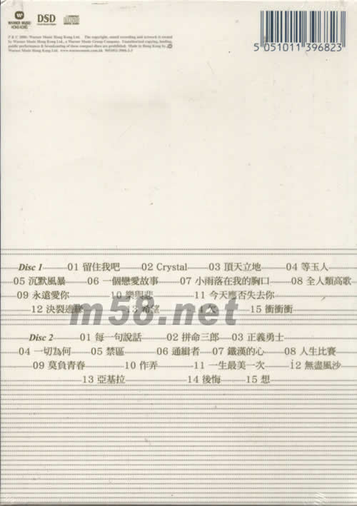 DISC 1 1.留住我吧 2.CRYSTAL 3.頂天立地 4.等玉人 5.沉默風暴 6.一個戀愛故事 7.小雨落在我的胸口 8.全人類高歌 9.永遠愛你 10.樂與悲 11.今天應否失去你 12.決裂邊緣 13.希望 14.欠 15.沖沖沖 DISC 2 1.每一句說話 2.拼命三郎 3.正義勇士 4.一切為何 5.禁區 6.通輯者 7.鐵漢的心 8.人生比賽 9.莫負青春 10.作弄 11.一生最美一次 12.無盡風沙 13.亞基拉 14.后悔 15.想