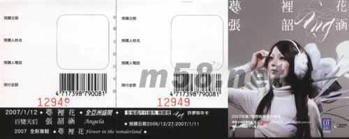 夢里花(臺灣唱片行預購版)(m58.net) 預購單尺寸:20*8CM 新年卡尺寸:30*21CM 隨CD附送:20072007韶光年歷 百變天后 張韶涵 Angela 2007年第1 個勇敢做夢的聲音 『夢里花 Flower in the wonderland』全面盛開 搶先預購禮『Ang許夢新年卡』 夢是自己的內在城堡 夢里是一個花與旋律的世界 一場聽覺與視覺的夢里花 關于成長蛻變與勇敢做夢的張韶涵 2007 全新專輯 夢里花 Flower in the wonderland 全面盛開