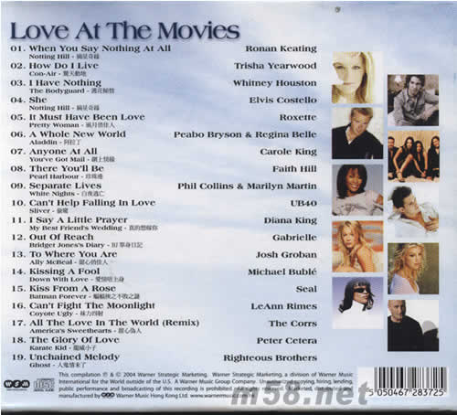 1、WHEN YOU SAY NOTHING AT ALL/NOTING HILL摘星奇緣 2、HOW DO I LIVE/CON--AIR驚天動地 3、I HAVE NOTHING/THE BODYGUARD雙花傾情 4、SHE/NOTTING HILL摘星奇緣 5、IT MUST HAVE BEEN LOVE/PRETTY WOMAN風月俏佳人 6、A WHOLE NEW WORLD/ALADDIN阿拉丁 7、ANYONE AT ALL/YOU’VE GOR MAIL網上情緣 8、THERE YOU‘LL BE/PEARL HARBOUR珍珠港 9、SEPARATE LIVES/WHITE NIGHTS白夜逃亡 10、CAN’T HELP FALLING IN LOVE/SLIVER偷窺 11、I SAY A LITTLE PRAYER/MY BEST FRIEND‘S DIARY-BJ單身日記 12、OUT OF REACH/BRIDGET JONES’S DIARY--BJ單身日記] 13、TO WHERE YOU ARE/ALLY MCBEAL甜心俏佳人 14、KISSING A FOLL/DOWN WITH OVE愛情唔上身 15、KISS FROM A ROSE/BATMAN FOREVER蝙蝠俠之不敗之謎 16、CAN‘T FIGHT THE MOONLIGHT/COYOTE UGLY妹力四射 17、以ALL THE LOVE IN THE WORLD(REMIX)/AMERICA’S SWEETHEARTS甜心偽人 18、THE GLORY OF LOVE/KARATE KID龍威小子 19、UNCHAINED MELODY/GHOST人鬼情未了