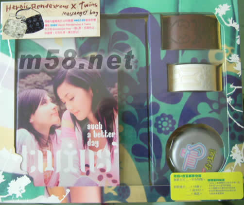 Such a Better Day (新曲+精選) 精美禮盒特別版(m58.net) 請點(diǎn)看產(chǎn)品正、背面及側(cè)面大圖 產(chǎn)品長*寬*高=27.5*23*5.5CM 產(chǎn)品凈重約:575克 /包裝后重量:725克 收錄4首全新歌包括 最新主打<冬令時間> 新歌推介 <18變> <追女仔> <精選> 隨碟重料加送 TWINS人氣潮爆男女裝皮手帶一對 合味道TWINS星閃閃鏡盒 紅太明舞茸赤靈芝$50現(xiàn)金券 新世界傳動網(wǎng)星MOBILE現(xiàn)金券 元綠美食優(yōu)惠券 馮碟內(nèi)優(yōu)惠券可以特HK$188換領(lǐng)原價價值$980HEROIC RENDEZVOUS x TWINS別注版MESSENGER BAG 一個(黑\杏兩色以供選擇,先到先得,換完即止) Twins在2004年可算是豐收的一年,今年除了已接拍超過10個廣告,加上內(nèi)地巡迴演唱會、唱片及電影。《Such a Better Day》新曲加精選專輯為她們的音樂成績作一個小結(jié)。