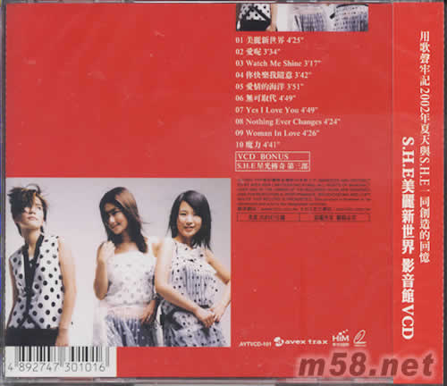 價(jià)格為估,以實(shí)到貨為準(zhǔn)! 美麗新世界影音館 卡拉OK VCD(m58.net) 生命中最閃亮的夏天 無可取代的青春回憶 收錄美麗新世界10首音樂錄影帶 原聲原形 音聲多重 VCD特別收錄 臺灣首席女聲團(tuán)體SHE星光傳奇第三部 用歌聲牢記2002年夏天與SHE一同創(chuàng)造的回憶