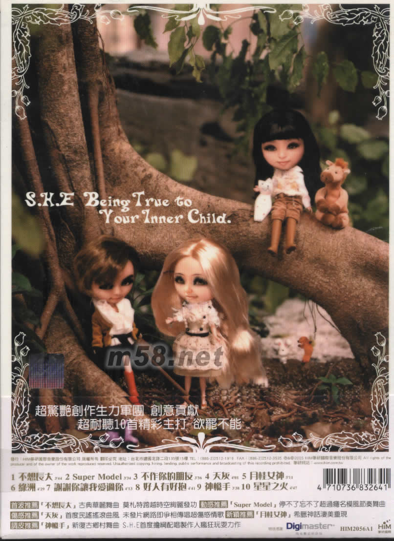 不想長(zhǎng)大(臺(tái)灣版)(m58.net) 隨專輯附贈(zèng):童話森林書(shū)卡一套 在這個(gè)復(fù)雜的世界 唱純真的歌S.H.E 2005最新美聲巨作 超驚艷創(chuàng)作生力軍團(tuán) 創(chuàng)意貢獻(xiàn) 超耐聽(tīng)10首精彩主打 欲罷不能 首批限量特別預(yù)購(gòu)贈(zèng)品S.H.E2006精美造型銀色唱盤造型月歷 銀色唱盤造型月歷 長(zhǎng):29cm 寬:16cm 高:1.5cm 內(nèi)含12張圓形歷卡,正面為S.H.E照片,反面為12個(gè)月份月歷可更換式放置于銀色唱盤造型桌歷上。 請(qǐng)參見(jiàn)大圖,對(duì)折后可立放于桌上。 首波推薦:[不想長(zhǎng)大]古典華麗舞曲 莫扎特跨越時(shí)空絢麗發(fā)功 動(dòng)感推薦:[SUPER MODEL]停不了忘不了超過(guò)癮名模風(fēng)節(jié)奏舞曲 傷感推薦:[天灰]首度民謠搖滾曲風(fēng) 未發(fā)片網(wǎng)路即爭(zhēng)相傳唱超傷感情歌 新穎推薦:[月桂女神]希臘神話凄美得現(xiàn) 調(diào)皮推薦[神槍手]新復(fù)古鄉(xiāng)村舞曲 S.H.E首度擔(dān)網(wǎng)配唱制作人瘋狂玩耍力作