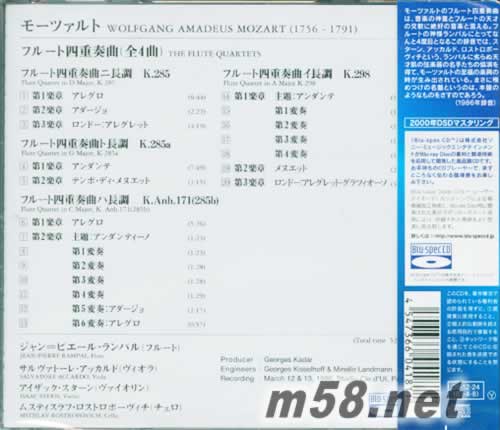 莫札特 長笛四重奏 藍光CD 日本版(m58.net) 莫札特的長笛四重奏樂曲,是一首音樂神童與橫笛神游交流之下的曼妙作品。獲譽為「長笛之神」的朗帕爾(Jean-Pierre Rampal),這是他的第四度錄音,但獲得史坦(Isaac Stern)、阿卡多(Salvatore Accardo)、羅斯托波維契(Mstislav Rostropovich)等與其齊名的世紀弦樂提琴家,共襄盛舉,打造出洋溢莫札特愉悅樂風的作品,絕對是一張名符其實的登峰造極之作。 (1986年錄音)