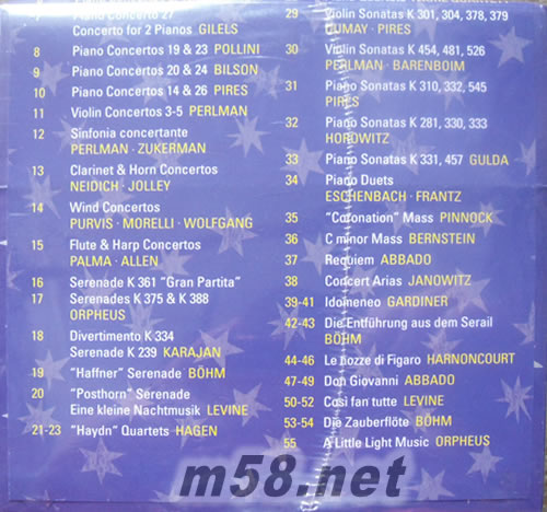 以下曲目, 因國外提供資料不夠完整, 若有誤植與出入, 敬請見諒) CD 1 第25,26,29號交響曲(平諾克) CD 2 第28,31,33,34號交響曲(李汶) CD 3 第32,35,36號交響曲(卡拉揚) CD 4 第38,39號交響曲(平諾克) CD 5 第40,41交響曲(明考夫斯基) CD 6 第6,17,21號鋼琴協奏曲(安達) CD 7 第27,10號鋼琴協奏曲(吉利爾斯) CD 8 第19,23號鋼琴協奏曲(波里尼) CD 9 第20,24號鋼琴協奏曲(比爾頌) CD 10 第14,26號鋼琴協奏曲(皮椰斯) CD 11 第3,4,5號小提琴協奏曲(帕爾曼) CD 12 交響協奏曲(帕爾曼、祖克曼) CD 13 管樂協奏曲輯(柰迪希、裘利) CD 14 管樂協奏曲輯(莫雷利、沃夫岡、埔爾維斯) CD 15 長笛與豎琴協奏曲輯(帕瑪、艾倫) CD 16 大組曲輯(奧菲斯室內樂團) CD 17 嬉游曲輯KV.375,K.388,K270(奧菲斯室內樂團) CD 18 嬉游曲輯KV.334,K.239 與小夜曲(卡拉揚) CD 19 哈佛納小夜曲(貝姆) CD 20 小夜曲(Eine Kleine Nachtmusik)與郵政號角小夜曲(李汶) CD 21-23 六首海頓四重奏(哈根四重奏) CD 24 弦樂四重奏K.515、嬉游曲K.563 (阿瑪迪斯四重奏) CD 25 弦樂四重奏K.516、K593(阿瑪迪斯四重奏) CD 26 管樂四重奏 (柯赫、賽佛特與(阿瑪迪斯四重奏) CD 27 室內樂曲(李汶、維也納-柏林合奏團) CD 28 鋼琴四重奏(佛瑞四重奏) CD 29 小提琴奏鳴曲輯(杜梅、皮耶絲) CD 30 小提琴奏鳴曲輯(帕爾曼、巴倫波英) CD 31 鋼琴奏鳴曲輯(皮耶絲) CD 32 鋼琴奏鳴曲輯(霍洛維茲) CD 33 鋼琴奏鳴曲輯(顧爾達) CD 34 鋼琴二重奏(法蘭茲、艾森巴哈) CD 35 C小調彌撒曲, KV 317 (平諾克) CD 36 C小調大彌撒曲(伯恩斯坦) CD 37 安魂曲(阿巴多) CD 38 音樂會詠嘆調(亞諾維茲) CD 39-41歌劇:伊多梅尼亞(賈第納) CD 42-43歌劇:后宮誘逃(貝姆) CD 44-46歌劇:費加洛婚禮(哈農庫特) CD 47-49歌劇:唐•喬望尼(阿巴多) CD 50-52歌劇:女人皆如此(李汶) CD 53-54歌劇:魔笛(貝姆) CD 55 輕鬆音樂輯(奧菲斯室內樂團)
