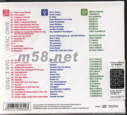 CD 1 1、PAPA LOVES MAMBO/PERRY COME/運動服品牌廣告曲 2、TRUE COLORS /CYNDI LAUPER/快餐店廣告曲 3、I BELLEVE I CAN FLY/R KELLY/銀行品牌廣告曲 4、LA VIE EN ROSE/TONY BENNETT&K D LANG 5、WHAT A WONDERFUL WOLD/LOUIS ARMSTRONG/電訊廣告曲 6、CAN‘T TAKE MY EYES OFF YOU/ANDY WILLAMS/啤酒廣告曲 7、WHAT THE WORLD NEEDS NOW/DIONNE WARWICK/樓盤廣告曲 8、WHAT A DIFFERENCE A DAY MADE/ARETHA FRANKLIN/銀行廣告曲 9、I’D LIKE TO TEACH THE WORLD TO SING(IN PERFECT HARMONY)/RAY CONNIFF &THE SINGERS/可樂汽水品牌廣告曲 10、JUST THE TWO OF US/GROVER WASHINGTON,JR WITH BILL WITHERS/嬰兒奶粉用品廣告曲 11、STAND BY ME /BEN E KING/巴士廣告曲 12、BORN FREE/THE PANCAKES/巴士品牌廣告曲 13、A /THE PANCAKES/銀行品牌廣告曲 14、PATRONAGE/THE PANCAKES/銀行品牌廣告曲 15、KOWIOON,HONG KONG/IRENE RYDER/保險公司廣告曲 16、MISERLOU /DICK DALE &HIS DEL-TONES/銀行信用卡廣告曲 DISC 2 1、ARIA/YANNI/航空公司廣告曲 2、JUST WAVE HELLO/CHARLOTTE CHURCH/汽車品牌廣告曲 3、I WILL COME TO YOU/HANSON/汽車品牌廣告曲 4、WALKING ON SUNSHINE/KATRINA AND THE WAVES/玩具品牌廣告曲 5、(SITTIN‘ON )THE DOCK OF THE RAY/MICHAEL BOLTON/香煙品牌廣告曲 6、YOU GOTTA BE /DES’REE/信用卡廣告曲 7、CLOSE TO YOU/KAREN MOK/樓盤廣告曲 8、MAS QUE NADA/JAZZPHONICS/運動服品牌廣告曲 9、IMAGINE/KEILO LEE /電訊公司廣告曲 10、WHEN WILL I SEE YOU AGAIN/THE THREE DEGREES/啤酒品牌廣告曲 11、MY GIRL /THE TEMPTATIONS/信用卡廣告曲 12、WAITING FOR A GIRL LIKE YOU/FOREIGER/啤酒廣告曲 13、EI MATADOR/LOS FABULOSOS/CADILLACS/電訊公司廣告曲 14、YOU SPIN ME ROUND(LIKE A RECORD)/DEAD OR ALIVE/手提電話廣告曲 15、TALKIN‘ TALK/D’SOUND/手提電話廣告曲 16、DOOMS NIGHT(TIMO MAAS RADIO EDIT)AZZIDO DA BASS/手提電話廣告曲