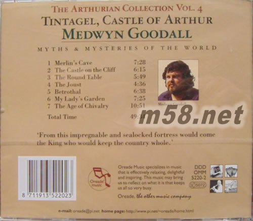 至今仍屹立在山澗中的Tintagel城堡,雖然已經滿目瘡痍,但記錄著一個凄涼而不失雄壯的故事。在本專輯《Tintagel, Castle of Arthur》(亞瑟城堡)中,Medwyn Goodall(梅得溫.古鐸)以亞瑟城堡為音樂背景,述說了縱橫馳騁的布列顛之王亞瑟的故事。亞瑟王傳說是最早的中世紀騎士傳說,經過藝人和民間的不斷加工而變得異常豐滿成熟。它包含了升斗小民在亂世之中對于英雄的幻想與期待,亞瑟王帶領武士抵抗外侮,斥退群敵,引領大英子民邁向盛世。它代表圓桌武士的精神,勇氣、忠誠與自制,對君主效忠,對弱者謙讓,對貧者布施。它代表了武士特質的兩難困境,英勇的藍斯洛愛上王妃,卻又必須對君主效忠,君臣關系成為情敵,最后以悲劇收場。