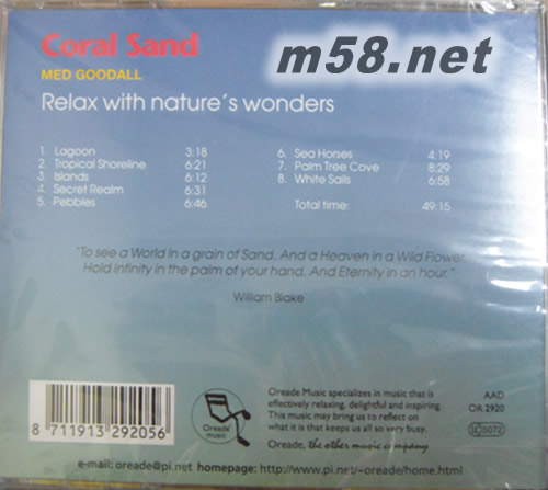 Coral Sand 珊瑚礁(m58.net) 繼《海豚之路》后,Medwyn Goodall 再次把我們帶入美麗神奇的大海,不過這次的主角是奇幻多彩的《珊瑚礁》。輕松、愉快的音樂把我們帶入了這個美麗的世界,讓我們忘記了所有的不快,感受到音樂描繪的充滿生命的珊瑚礁的活力!