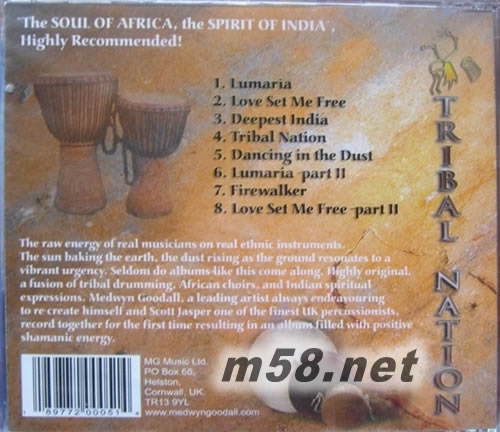 Tribal Nation 部落民族(m58.net) Tribal shamanic drumming with African choirs and spiritual expression from India. The raw energy of real musicians on real ethnic instruments. The sun baking the earth, the dust rising as the ground resonates to a vibrant urgency. Seldom do albums like this come along. Highly original, a fusion of tribal drumming, African choirs, and Indian spiritual expressions. Medwyn Goodall, and Scott Jasper one of the finest UK percussionists, record together for the first time resulting in an album filled with vibrant shamanic energy.