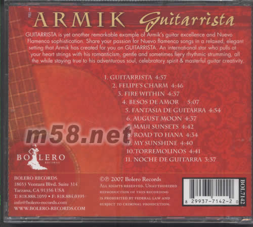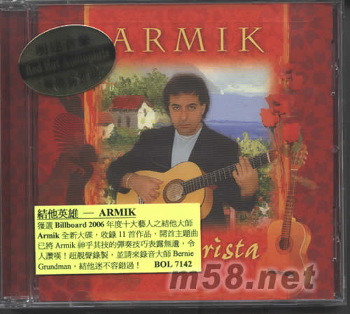 結他英雄(m58.net) 結他英雄-ARMIK 獲選Billboard 2006年度十大藝人之結他大師Armik全新大碟,收錄11首作品,開首主題曲已將Armik神乎其技的彈奏技巧表露無遺,令人贊嘆!超靚聲錄制,并請來錄音大師Bernie Grundman,結他迷人不容錯過!