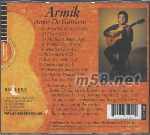 世界級法蘭明高結他大師ARMIK專輯,“AMOR DE GUITARRA”,收錄十一首由ARMIK親自作曲及編曲之作品,開首的主題曲即充份將其登峰造極的彈奏技巧表露無遣,ARMIK式的浪漫柔情法蘭明高結他曲式。將ARMIK的愛及歡樂帶給聽眾。美國BOLERO RECORDS超級靚聲錄制,結他聲清脆玲瓏,撥弦色彈、和弦轉換、結他音箱等所發出的聲音,全部呈現于聽眾眼前。