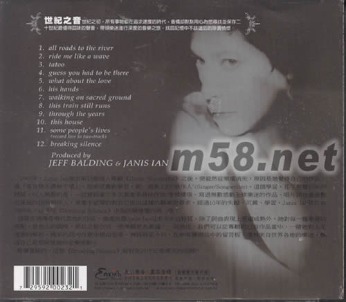 BREAKING SILENCE打破沉默(m58.net) 1983年 ,JANIS IAN推出第13張個人專輯[UNCLE WONDERFUL]之后,就毅然從樂壇消失,原因是她覺得自己的作品,像[落在排水溝般不堪],她希望重新學習,做一個真正的“唱作人”(Singer/Songwriter)。這個學習,花了整整10年的時間。叫人佩服的是,一位曾經拿下多次葛萊美最佳作曲/專輯獎項,寫過無數感動全球樂迷的作品,唱片銷售量達數百萬張的頂級創作人,竟毫不留情的對自己做出這樣的鞭策與要求。經過10年的失蹤,沉殿,學習,JANIS IAN終于在1993年,以這張《BREAKING SILENCE》作為回歸樂壇的第一炮! 這張充滿傳奇與代表性的作品,處處流露JANI追求完美的特質,除了詞曲表現上更超成熟外,她對每一種樂器的搭配,音色上的調校,都比之前任何一張專輯更為嚴謹。一如過往,我們可以從專輯的12首作品當中,一睹她對人生透澈的解析,精采的詞句在歌中俯拾皆是,無怪時至今日,在她專屬網站的留言板,還有來自世界各地的樂迷,暢述自己是如何被她的音樂感動。 無庸置疑的,這張《BREAKING SILENCE》絕對是20世紀最漂亮的回歸!