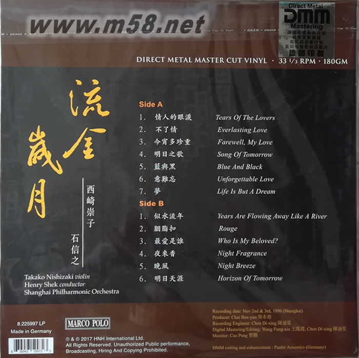 流金歲月 西崎崇子 石信之 黑膠(m58.net) 經典作品“流金歲月”一度牽起小提琴懷舊音樂熱潮,多首耳熟能詳的作品首度以黑膠唱片推出,琴聲更有立體感,錄音效果絕佳。現由“老虎魚”重新母盤錄制,音質更清晰,層次感更豐富。 33 1/3轉‧180克德國印製,首500張限量編號紀念發行。 流金歲月 上海交響樂團‧石信之指揮