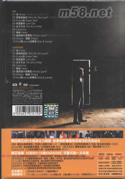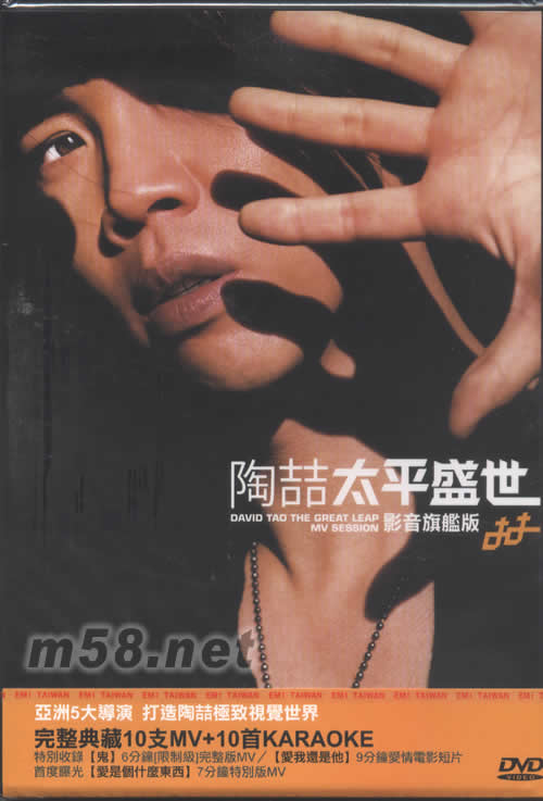 太平盛世影音旗艦版DVD(m58.net) 亞洲5大導演 打造陶喆極致視覺世界 完整典藏10支MV+10首KARAOKE 原聲原影卡拉OK 陶喆與亞洲5大導演合力開創 音樂與影像最具突破性的完美結合 [鬼]廣告金像獎導演/亞洲MV創意大師-Jeff [愛我還是他]亞洲情感戲劇MV大師/著名廣告導演-林錦和 [Susan說]金曲獎最佳導演/亞洲廣告名導-鄺盛 [孫子兵法]國際級廣告大師/電影導演-彭文淳 [Catherine]人文時尚視覺大師/金曲獎最佳導演-黃中平 特別收錄:[鬼] 6分鐘[限制級]完整版MV/[愛我還是他]9分鐘愛情電影短片 首度曝光[愛是個什么東西]7分鐘特別版MV