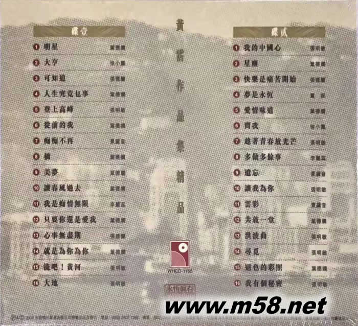 DISK 1 1. 明星 - 葉德嫻 2. 大亨 - 徐小鳳 3. 可知道 - 張德蘭 4. 人生究竟?事 - 葉德嫻 5. 登上高峰 - 張明敏 6. 從前的我 - 葉德嫻 7. 癡癡不再 - 景黛音 8. 橋 - 葉德嫻 9. 美夢 - 葉德嫻 10. 讓春風過去 - 葉德嫻 11. 我是癡情無限 - 李麗蕊 12. 只要你還是愛我 - 葉德嫻 13. 心事無盡期 - 張德蘭 14. 就是為你為你 - 葉德嫻 15. 流吧!黃河 - 張明敏 16. 大地 - 張明敏 DISK 2 1. 我的中國心 - 張明敏 2. 星塵 - 葉德嫻 3. 快樂是痛苦開始 - 張德蘭 4. 夢是永恒 - 薰妮 5. 愛情味道 - 葉德嫻 6. 問我 - 徐小鳳 7. 趁著青春放光芒 - 張光敏 8. 多做多余事 - 張麗蕊 9. 遺忘 - 景黛音 10. 讓我為你 - 張明敏 11. 云彩 - 景黛音 12. 共敘一堂 - 葉德嫻 13. 洪波曲 - 張明敏 14. 尋覓 - 張明敏 15. 退色的彩照 - 葉德嫻 16. 我有個祕密 - 張明敏