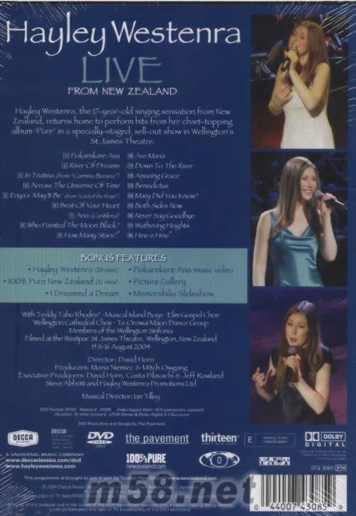HAYLEY WESTENRA LIVE FROM NEW AEALAND(新西蘭演唱會DVD)(m58.net) 200萬銷量美少女 從天而降的天籟之聲 最新紐約西蘭現場音樂會DVD-9 5.1環回體聲 全碟120分鐘足本 首次收錄JONI MITCHELL 大熱作品 BOTH SIDES NOW KATE BUSH 成名作 17 WUTHERING HEIGHTS 電臺熱播歌6 BEAT OF YOUR HEART 付送 HAYLEY獨家專訪(30分鐘) 紐西蘭旅游特輯 POKAREKARE ANA MV