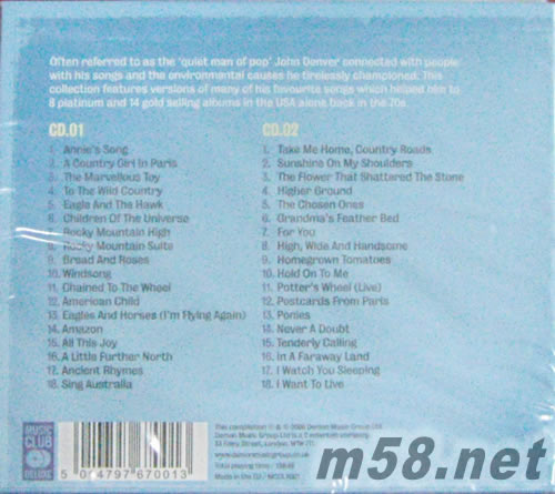 價格為估,以實到貨為準! Annie’s Song (鄉謠情懷)(m58.net) 美國民謠民歌王子JOHN DENVER雙CD精選專輯,輯錄經曲名曲多首,一連呂清新動人的歌聲百聽不厭,重新混音推出,讓樂迷欣賞最真摯動人的歌聲。