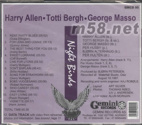價格為估,以實到貨為準! NIGHT BIRDS夜鳥(m58.net) 請點看產品正、背面大圖 夜鳥NIGHT BIRDS 兩位薩克斯皇TOTTI BERGH 與HARRY ALLEN 破天荒聯手合作,聯同小號大師GEORGE MASSO ,加上多位實力樂師精彩灌錄十一首經典迷人的永恒爵士樂極品。兩薩克斯風與小號的音適分明,鋼琴、鼓及貝斯等樂器的定位表演無懈可擊,音響表演至臻示范極數。