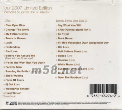 Disc 1 01. Blue Eyes Blue 02. Change The World 03. My Father's Eyes 04. Tears In Heaven 05. Layla 06. Pretending 07. Bad Love 08. Before You Accuse Me(Take A Look At Yourself) 09. It's In The Way That You Use It 10. Forever Man 11. Running On Faith(Unplugged) 12. She's Waiting 13. River Of Tears 14. (I) Get Lost 15. Wonderful Tonight 16. Hard Times Special Bonus Disc(Disc 2) 01. Say What You Will 02. I Ain't Gonna Stand For It 03. So Tired 04. Back Home 05. If I Had Posession Over Judgement Day 06. Old Love 07. Bell Bottom Blues(Live) 08. Badge(Live) 09. Cocaine(Live) 10. White Room(Live) 11. Sunshine Of Your Love(Live) 12. Layla(Live) 13. Over The Rainbow(Live)