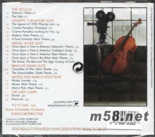 YO-YO MA PLAYS ENNIO MORRICONE 電影琴緣馬友友(m58.net) 意大利國寶級配樂大師Ennio Morricone是當代最受歡迎與備受敬重的電影音樂家。四十多年來,與他合作過的導演都是當代最知名的大師級人物,由他創作的電影、電視音樂作品超過500部,風格跨越爵士、流行、前衛、古典及最著名的意大利西部片風格。他的音樂創作讓他五度入圍奧斯卡最佳電影原創音樂提名,同時也為他贏得無數的獎座,包括2座金球獎、1座葛萊美獎、5座英國電影學院獎、6座意大利電影獎、8座意大利國家影評學會獎。 在2001年的奧斯卡頒獎典禮中,上臺演奏奧斯卡得獎音樂作品《臥虎藏龍》的馬友友遇見了以《Malena(真愛伴我行)》配樂入圍的Ennio Morricone。這次會面給了Ennio Morricone將自己的電影配樂譜成與電影樂章共舞的大提琴作品的靈感,這才成就了這張專輯。當Ennio Morricone最具情感的浪漫電影音樂與馬友友充滿生命悸動的大提琴偶然邂逅,兩位不同領域的音樂人對音樂的深厚情感立刻迸發出絢麗的火花。 在這張讓兩人的合作永生難忘的專輯中,Ennio Morricone對《The Legend Of 1900(海上鋼琴師)》、《Nuovo Cinema Paradiso(新天堂樂園)》、《The Mission(教會)》、《Once Upon A Time In America(美國往事)》、《Malena真愛伴我行》、《The Good, The Bad and The Ugly(黃昏三鏢客)》、《The Untoucbables(鐵面無私》、《Casualties of Way(越戰創傷)》、《Once Upon A Time In the West(狂沙十萬里)》、《The Lady Caliph嘉莉琺夫人》、《Moses(摩西傳)》、《Marco Polo(馬可波羅)》這些跨度達半個世紀的電影音樂作品進行了重新編排,保留了原樂章的結構,同時為馬友友的大提琴設置了最佳的樂章切入點,讓馬友友跟他的大提琴有最精彩的揮灑與表達的空間。而馬友友在演繹過程中,一再贊嘆這些旋律給他的內心帶來的感動與震撼,對作品的共鳴加上對音樂非凡的理解能力使他能夠釋放出如泣如訴,戲味十足的琴音,與旋律本身演出精彩的對話。無論是《The Mission》里那種哀莫大于心死的慨嘆,還是《The Good, The Bad and The Ugly》中縱橫江湖的霸氣,使我們再次體驗到電影音樂捕捉影像靈魂的精髓。而大提琴特有的音色,更為每首曲子增添了深入內心的浪漫情懷。錄制本張專輯時,Ennio Morricone親自指揮羅馬交響樂團為馬友友伴奏,并盛贊馬友友為大提琴與管弦樂之間創造了一份情同手足的深刻情誼,而這些樂章在大提琴演奏下,更加熠熠生輝。在與Ennio Morricone合作過后,馬友友以簡單誠摯的話語贊美這位傳奇的配樂大師道:"對我來說,你就是一位偉大的音樂家。" 前所未有的夢幻合作,如果您喜歡古典音樂或是電影原聲的忠實聽眾,您又怎能錯過!