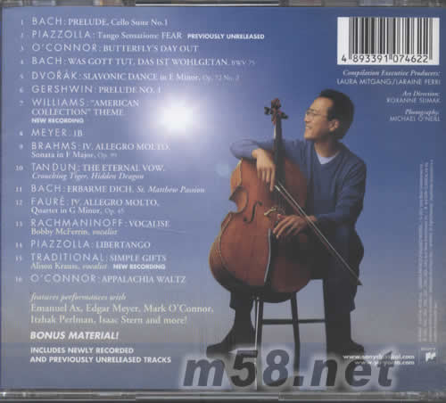 1、BACH:PRELUDE CELLO SUITE NO 1 2、PIAZZOLLA TANGO SENSATIONS FEAR 3、O CONNOR BUTTERFLY‘S DAY OUT 4、BACH WAS GOTT TUT DAS IST WOHLGETAN 5、DVORAK :ALAVONIC DANCE IN E MINOR OP 72 NO 2 6、GERSHWIN PRELUDE NO 1 7、WILLIAMS AMERICAN COLLECTION THEME 8、MEYER:IB 9、BRAHMS :IV ALIEGRO MILTO SONATO IN F JAJOR 10、TAN DUN :THE ETERNAL VOW 11、BACH:ERBARME DICH ST MATTBEW PASSION 12、FAURE IV ALEGRO MOLTO 13、RACHMANINOFF:VOCALISE 14、IPAZZOLLA LIBERTANGO 15、TRADITIONAL:SIMPLE GIFTS 16、O’CONNOR:APPALACHIA WALTZ