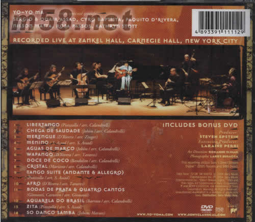 01 LIBERTANGO 02 CHEGA DE SAUDADE 03 MERENGUE 04 MENINO 05 AGUAS DE MARCO 06 WAPANGO 07 DOCE DE COCO 08 CRISTAL 09 TANGO SUITE(ANDANTE &ALLEGRO) 10 AFOR 11 BODAS DE PRATA & QUATRO CANTOS 12 AQUARELA DO BRASIL 13 EITA 14 SO DANCO SAMBA INCLUDES BONUS DVD Prodneer: STEVEN EPSTEIN Executive Producer: LARAINE PERRI Art Direction:ROXANNE SLIMAK Photograpbhy:LARRY BUSACCA