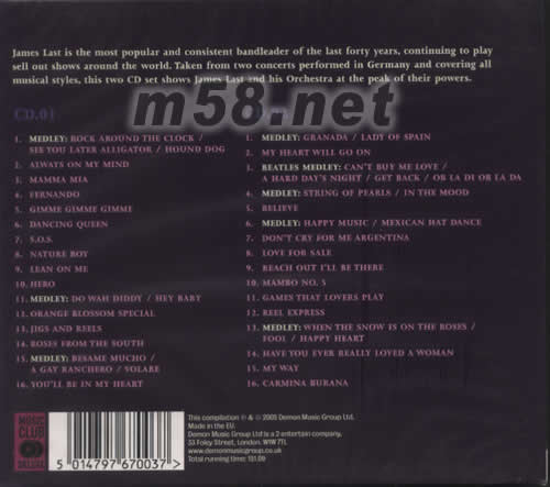 CD.01 01 MEDLEY:ROCK AROUNDTHE CLOCK/SEE YOU LATER ALLIGATOR/HOUND DOG 02 ALWAYS ON MY MIND 03 MAMMA MIA 04 FERNANDO 05 GIMME GIMME GIMME 06 DANCING QUEEN 07 S.O.S 08 NATURE BOY 09 LEAN ON ME 10 HERO 11 MEDLEY:DOWAH DIDDY/HEY BABY 12 ORANGE BLOSSOM SPECIAL 13 JIGS AND REELS 14 ROSES FROM THE SOUTH 15 MEDLEY:BESAME MUCHO/A GAY RANGHERO/VOLARE 16 YOU'LL BE IN MY HEART CD.02 01 MEDLEY:GRANADA/LADY OF SPAIN 02 MY HEART WILL GO ON 03 BEATLES MEDLEY:CAN'T BUY ME LOVE/A HARD DAY'S NIGHT/GET BACK/OB LA DI OR LA DA 04 MEDLEY:STRING OF PEARLS/IN THE MOOD 05 BELIEVE 06 MEDLEY:HAPPY MUSIC/MEXICAN HAT DANCE 07 DON'T CRY FOR ME ARGENTINA 08 LOVE FOR SELE 09 REACH OUT I'LL BE THERE 10 MAMBO NO.5 11 GAMES THAT LOVERS PLAY 12 REEL EXPRESS 13 MEDLEY:WHEN THE SNOW IS ON THE ROSES/FOOL/HAPPY HEART 14 HAVE YOU EVER REALLY LOVED A WOMAN 15 MY WAY 16 CARMINA BURANA