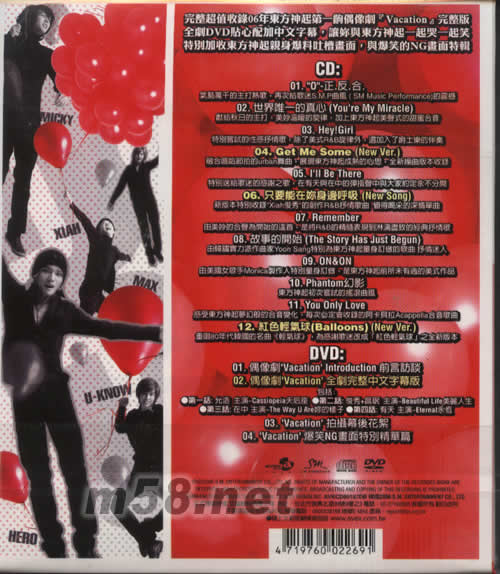 CD 01. "O"-正.反.合. 02. 世界唯一的真心(You're my miracle) 03. Hey!Girl 04. Get me some(New Ver.) 05. I'll be there 06. 只要能在你身邊呼吸(New Song) 07. Remember 08. 故事的開始(The story has just begun) 09. ON & ON 10. Phantom(幻影) 11. You only love 12. 紅色輕氣球(Balloons)(New Ver.) DVD 01. 偶像劇"Vacation" Introduction 前言訪談 02. 偶像劇 "Vacation" 全劇完整中文字幕版 包括: 第一話:允浩 主演-Cassiopeia天后座 第二話:俊秀+昌珉 主演-Beautiful Life美麗人生 第三話:在中 主演-The Way U Are你的樣子 第四話:有天 主演-Eternal永恒 03. "Vacation" 拍攝花絮 04. "Vacation" 爆笑NG畫面特別精華篇
