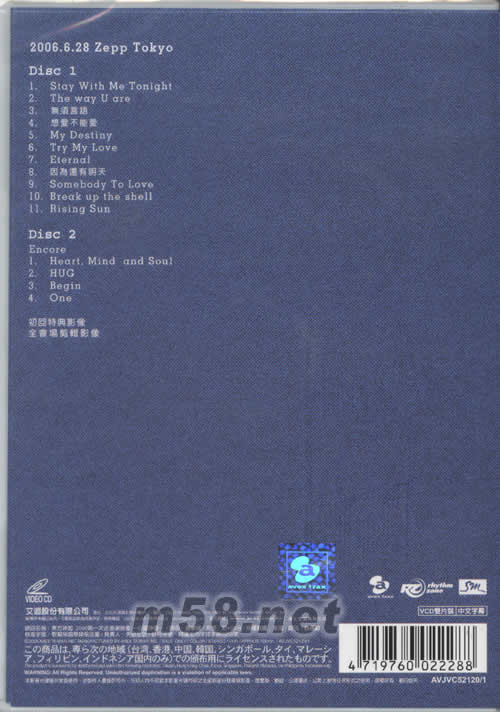 2006.6.28 Zepp Tokyo Disc 1 01. Stay With Me Tonight 02. The way U are 03. 無需言語 04. 想愛不能愛 05. My Destiny 06. Try My Love 07. Eternal 08. 因為還有明天 09. Somebody To Love 10. Break up the shell 11. Rising Sun Disc 2 Encore 01. Heart Mind and Soul 02. HUG 03. Begin 04. One 初回特典影像 全會場剪輯影像