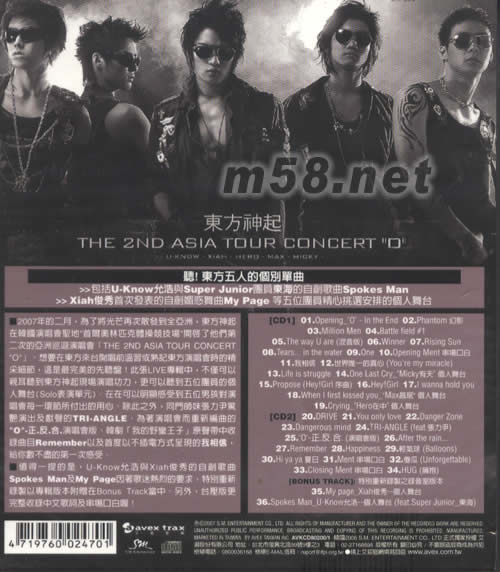 “O”亞洲巡回現場LIVE 精選CD(海外版)(m58.net) 東方神起2007年亞洲巡回演唱會,首場完整全記錄! 感受現場36000人的熱情沸騰與感動!內附28頁全彩現場寫真歌詞本! 2007年10月首度來臺演唱會火熱搶聽盤! 包括GTV韓劇[我的野蠻王子]原聲帶收錄插曲REMEMBER 特別收錄,錄音室新錄制新曲2首! 師妹張力尹現場驚艷共同演出的TRI ANGLE 完整收錄中文歌詞+串場口白翻譯,讓你如臨現場一起瘋狂!