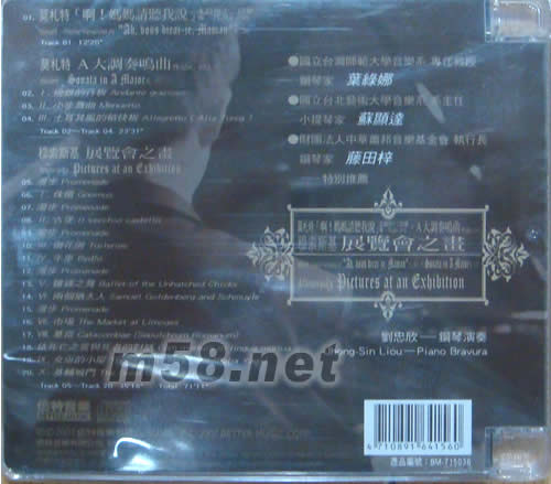莫札特:A大調奏鳴曲,作品K. 331 (300i) Mozart: Sonata in A Major, K. 331 (300i) Track 02 Ⅰ. 優雅的行板 Andante grazioso Track 03 Ⅱ. 小步舞曲 Menuetto Track 04 Ⅲ. 土耳其風的稍快板 Allegretto ( Alla Turca ) 穆索斯基:展覽會之畫 Mussorgsky: Pictures at an Exhibition Track 05 漫步 Promenade Track 06 Ⅰ. 侏儒 Gnomus Track 07 漫步 Promenade Track 08 Ⅱ. 古堡 Il vecchio castello Track 09 漫步 Promenade Track 10 Ⅲ. 御花園 Tuileries Track 11 Ⅳ. 牛車 Bydlo Track 12 漫步 Promenade Track 13 Ⅴ. 雛雞之舞 Ballet of the Unhatched Chicks Track 14 Ⅵ. 兩個猶太人 Samuel Goldenberg and Schmuyle Track 15 漫步 Promenade Track 16 Ⅶ. 市場 Limoges:The Market at Limoges Track 17 Ⅷ. 墓窟 Catacombae (Sepulchrum Romanum) Track 18 依死亡之言與死者的對話 Cum mortuis in lingua mortua Track 19 Ⅸ. 女巫的小屋 The Hut on Hen's Legs (Baba Yaga) Track 20 Ⅹ. 基輔城門 The Great Gate of Kiev