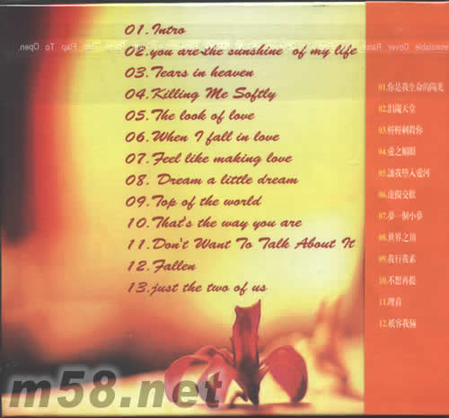 1、INTRO 2、YOU ARE THE SUNSHINE OF MY LIFE/你是我生命的陽(yáng)光 3、TEARS IN HEAVEN/淚灑天堂 4、KILLING ME SAFTLY/溫柔的殺我 5、THE LOOK OF LOVE/愛(ài)之媚眼 6、WHEN I FALL IN LOVE/當(dāng)我墮入愛(ài)河 7、FEEL LIKE MAKING LOVE/虛擬交歡 8、DREAM A LITTLE DREAM/夢(mèng)一個(gè)小夢(mèng) 9、TOP OF THE WARLD/世界之巔 10、THAT‘S THE WAY YOU ARE/我行我素 11、DON’T WANT TO TALK ABOUT IT /不想再提 12、FALLEN/埋首 13、JUST THE TWO OF US /只容我倆