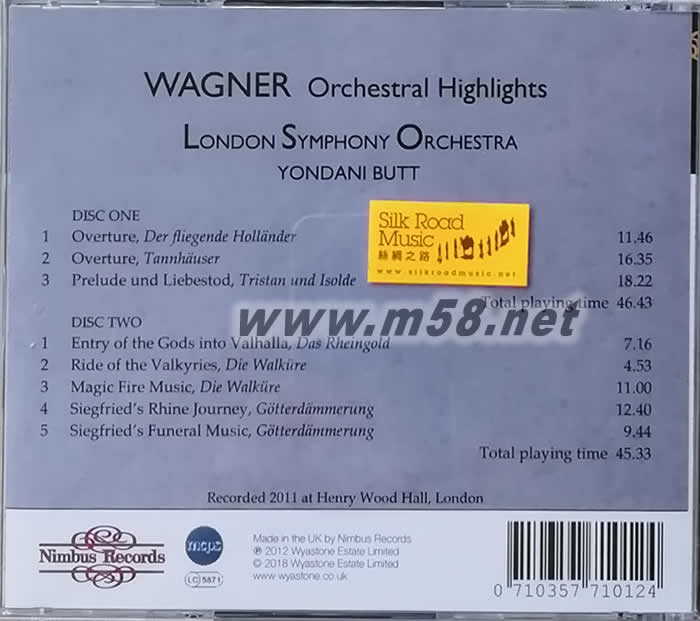 CD(1) 1.Overture, Der fliegende Hollander 2.Overture, Tannhauser 3.Prelude und Liebestod, Tristan und Isolde CD(2) 1.Entry of the Gods inti Valhalla, Das Rheingold 2.Ride of the Valkyries, Die Walkure 3.Magic Fire Music, Die Walkure 4.Siegfried’s Rhine Journey, Gotterdammerung 5.Siegfried’s Funeral Music, Gotterdammerung