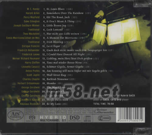 1.ST.LOUIS BLUES 2.SOMEWHERE OVER THE RAINBOW 3.HIT THE ROAD,JACK 4.IT DON'T MEAN A THING 5.LITTLE BROWN JUG 6.LOCH LOMOND 7.NUR NICHT AUS LIEDE WEINEN 8.A MOMENT FOR MORRICONE 9.IRISH BLESSING 10.LA VI LLEGAR 11.GUCK DOCH NICHT IMMER NACH DEM TANGOGEIGER HIN 12.I COULD HAVE DANCED ALL NIGHT 13.LIEKLING ,MEIN HERZ LASST DICH GRIIBEN 14.TANZ MAL WIEDER BOSSA-NOVA 15.SCHONER GIGOLO,ARMER GIGOLO 16.AM SONNTAG WILL MEIN SUBER MIT MIR SEGELN GEH 'N 17.WALL STREET RAG 18.BATHTUDB NONSENSE 19.MAMBO 20.THE MAN I LOVE 21.EMBRACEADLE YOU 22.I GOT RHYTHM 23.WEIBT DU ES NOCH 24.BE MY LOVE