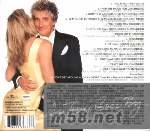 1、TIME AFTER TIME一次又一次 瘦皮猴法蘭克辛納屈招牌名曲 2、I’M IN THE MOOD FOR LOVE戀愛進行式 30年代歌壇廣告巨作,98電影[禁忌迷情](LOKITA)插曲 3、DON‘T GET AROUND MUCH ANYMORE我心己打烊 艾靈頓公爵金曲電影[當哈利碰上莎莉]插曲 4、BEWITCHED,BOTHERED BE ILDERED(DUET WITH CHER)意亂情迷 金凱利主演百老進首演音樂劇[PAL JOEY]主題曲 5、’TILL THERE AS YOU 真到愛上你 1958年東尼音樂劇[THE MUSIC MUSIC MAN]名曲 6、UNTIL THE REAL THING COMES ALONG直愛降 7、HERE OR HEN 何時何處 1937年百老進[BABES IN ARMS]經典[電影[當哈利碰上莎莉]插曲 8、SMILE帶著微笑 一代笑匠卓別林演唱會出電影[摩登時代]主題曲 9、MY HEART STOOD STILL心如止水[真善美]音樂劇中創作家名曲 10、SOMEONE TO ATCH OVER ME但愿有情人 盍希文兄弟曠世距作,電影[春風化雨1996]、[情人保護]插曲 11、AS TIME GOES BY(DUET WITH QUEEN LATIFAH)流金風月 電影[北非謀影]主題曲、主題曲電影[西雅圓未眼]插曲 12、I ONLY HAVE EYES FOR YOU我眼中只有你 電影[美麗風情書]、[小鬼初戀]插曲 13、CRAZY SHE CALLS ME 為愛瘋狂 查特貝克、納京高傳唱,橫跨30-70年代作拍檔招牌曲 14、OUR LOVE IS HERE TO STAY FHW 真愛不移 盍希文兄弟經典情歌,電影[當哈利碰上莎莉]、[忘情巴黎]插曲 BONUS TRACK 15、DON‘T GET AROUND MUCH ANYMORE(DUET WITH ALESSANDRA SAFINA)我心己打爛 洛史都華與義大利新世代歌神沙費納首度合唱,臺灣版特別收錄
